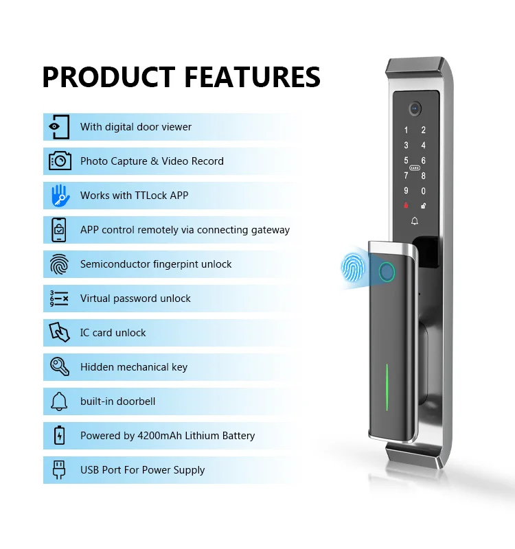 Tuya & TT Lock Smart Digital Door Lock avec caméra APP/empreinte digitale/carte/mot de passe/vérification mécanique de la clé